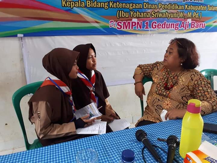 Di sela-sela coffe break, ibu Kabid meluangkan waktu berbincang dengan siswa terbaik SMPN 1 Gedungaji Baru, yaitu Irka Paula Ananda kelas 8.b dan Putri Lestari kelas 8.a.