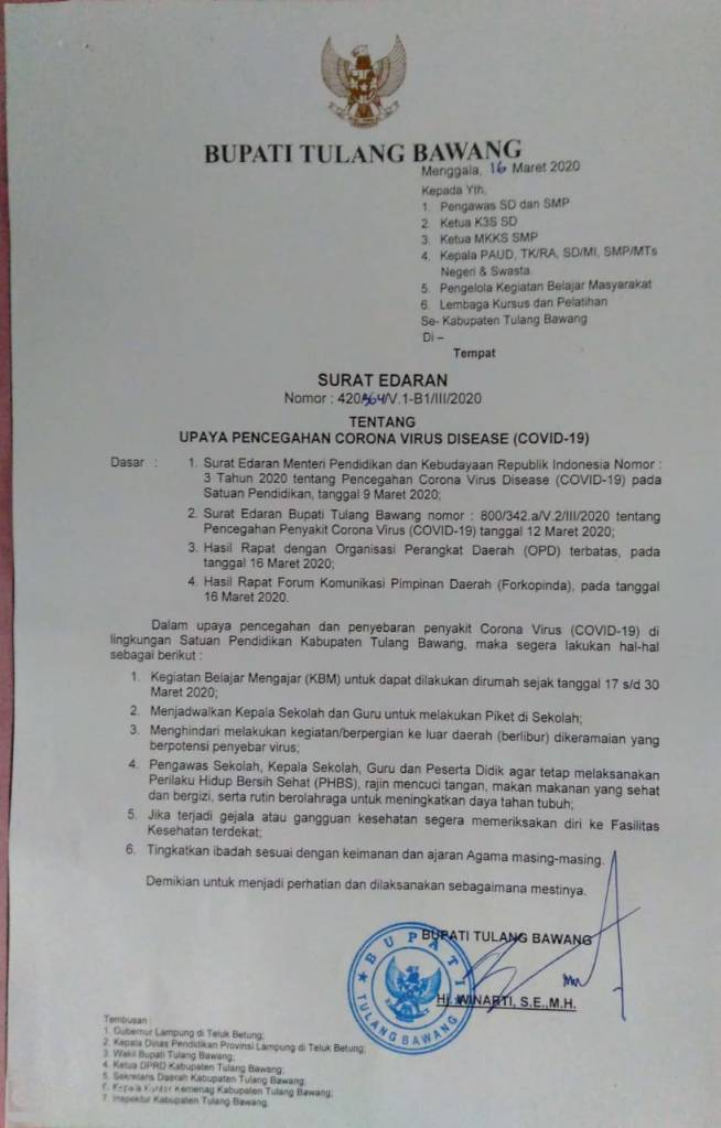 Spansagaba.com, Gedungaji Baru – Menindaklanjuti Surat Edaran Bupati Tulang Bawang No. 420/364/V.1-B1/III/2020 tanggal 16 Maret 2020 tentang Upaya Pencegahan Corona Virus Desease (COVID-19), Kepala SMPN 1 Gedungaji Baru ‘merumahkan’ para siswanya mulai tanggal 17 sampai dengan 30 Maret 2020.