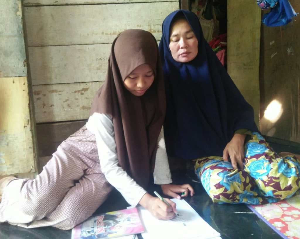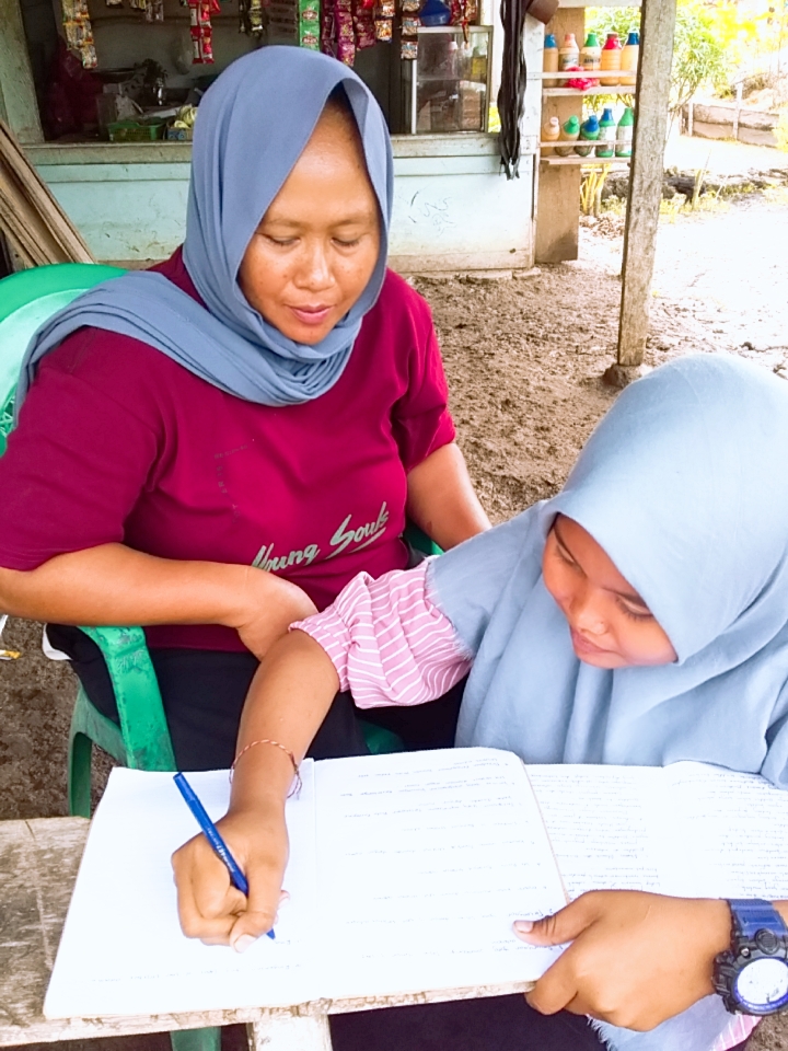 Sementara itu para siswa belajar daring, sebagian didampingi orang tuanya.