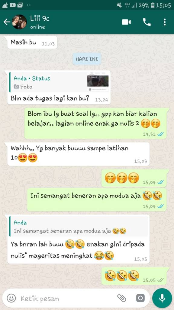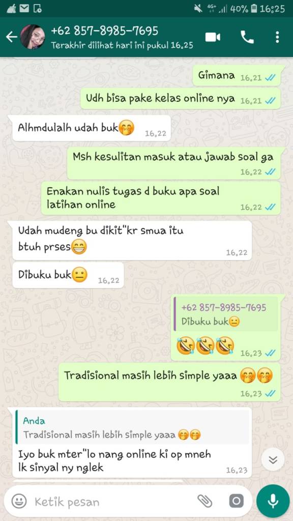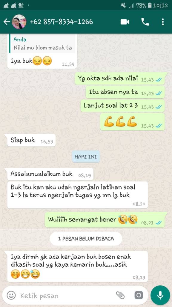 Pada minggu pertama belajar daring, saya hanya menggunakan media chatting untuk memantau pembelajaran di rumah yang dilakukan para siswa. Kegiatan pada minggu pertama berjalan lancar dan mendapat respon yang cukup baik, hanya saja memang menimbulkan kerepotan tersendiri karena HP harus standby merespon setiap kiriman tugas dari siswa.