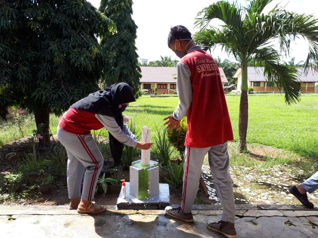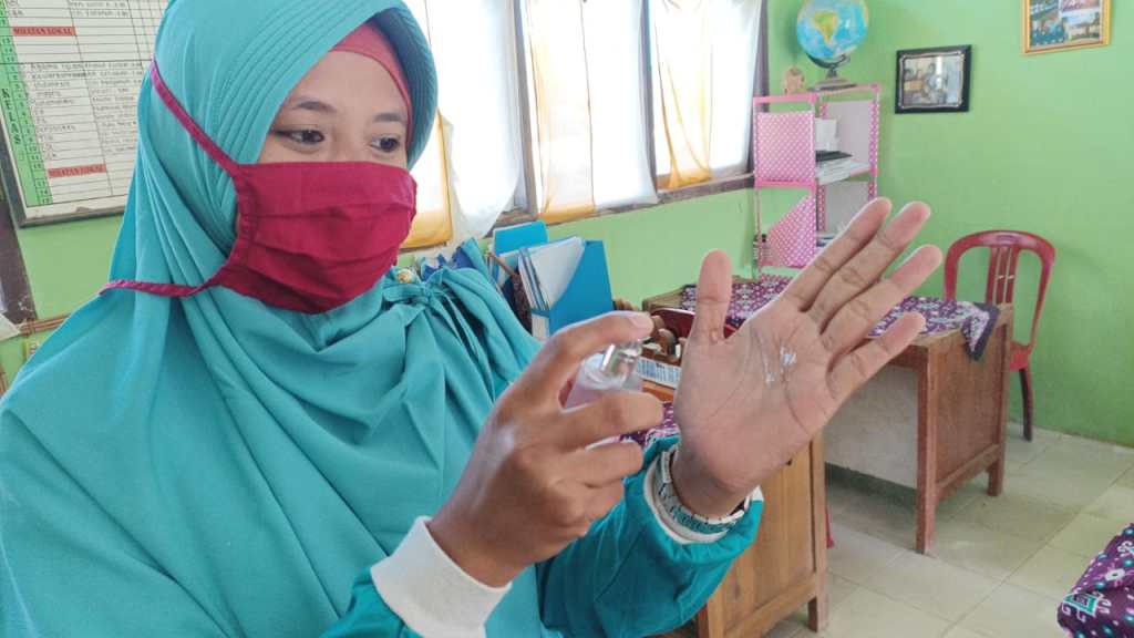 Menggunakan hand sanitazer untuk mensterilkan diri dari virus.