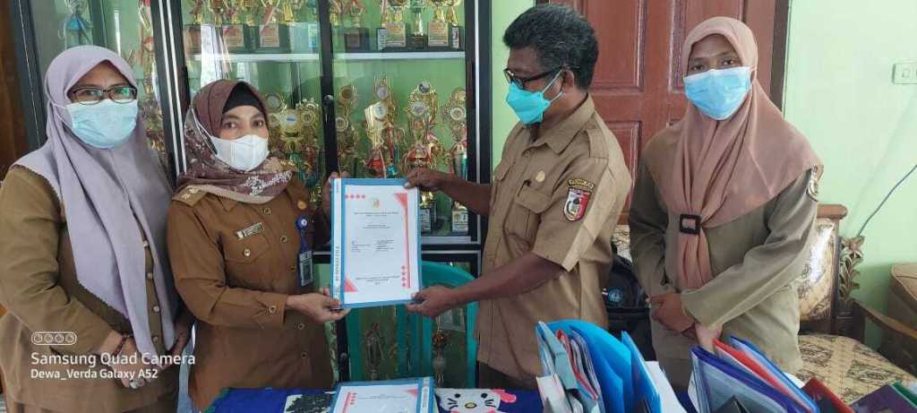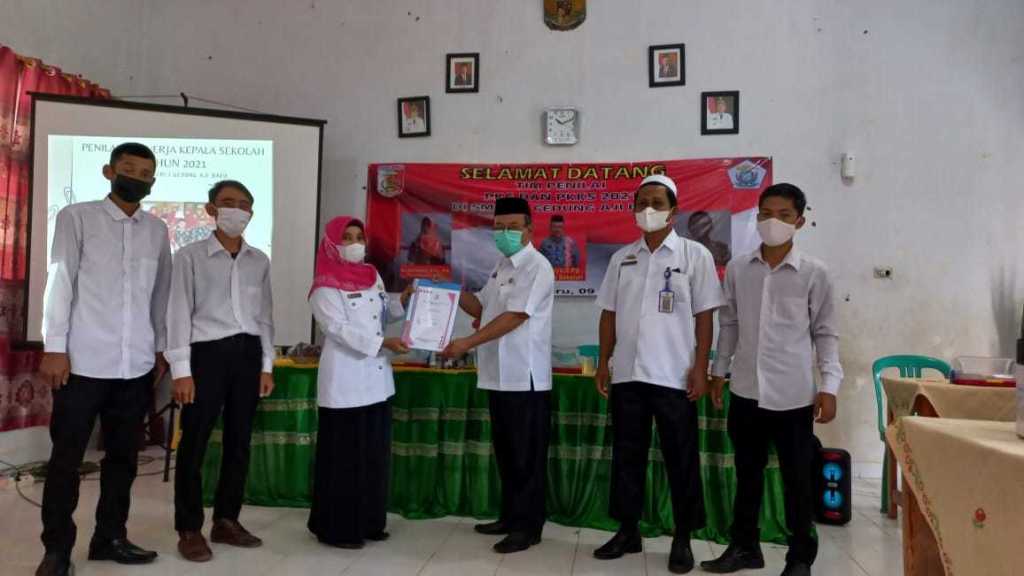 Ketua tim penilai PKKS menyerahkan dokumen hasil penilaian kepada Kepala SMPN 1 Gedung Aji Baru disaksikan anggota tim dan dewan guru. (9/12/2021)