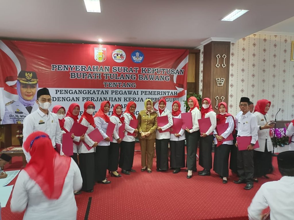 smpn1gedungajibaru.school.blog, Tulang Bawang – Bupati Tulang Bawang Dr. Hj. Winarti, S.E.,M.H. telah menandatangani dan membagikan Surat Keputusan (SK) pengangkatan guru Pegawai Pemerintah dengan Perjanjian Kerja (PPPK).