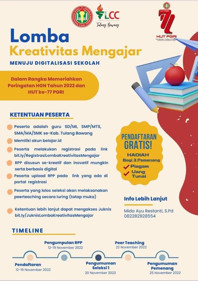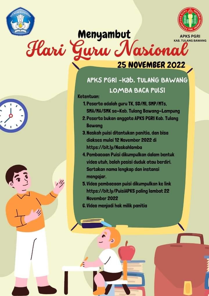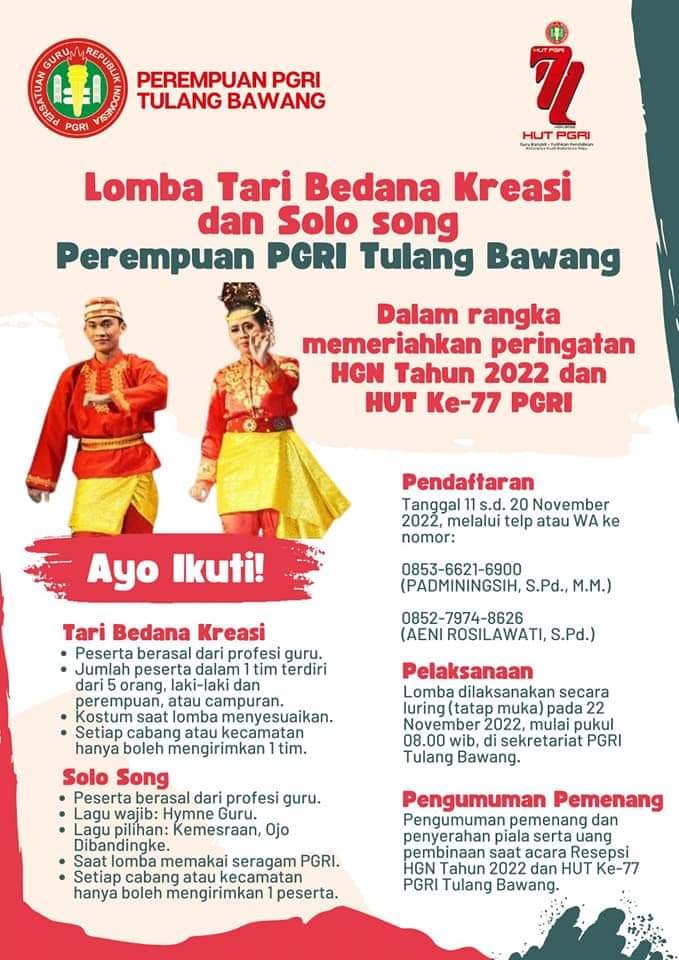 “Ayo para guru hebat Tulang Bawang kita meriahkan Hari Guru Nasional Tahun 2022 dan HUT PGRI ke-77 dengan mengikuti berbagai lomba. Segera daftarkan diri Anda, ya. Hubungi CP dan PGRI masing-masing kecamatan. GURU BANGKIT, PULIHKAN PENDIDIKAN: INDONESIA KUAT – INDONESIA MAJU”, ujarnya melalui pesan singkat WhatsApp.
