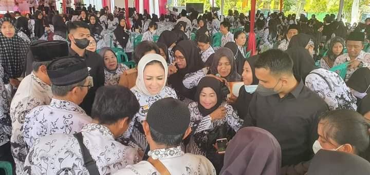 spensagaba, Tulang Bawang – Bupati Kabupaten Tulang Bawang, Dr. Hj. Winarti, S.E., M.H. membaur menyatu bersama dengan seribuan guru se-Kabupaten Tulang Bawang.