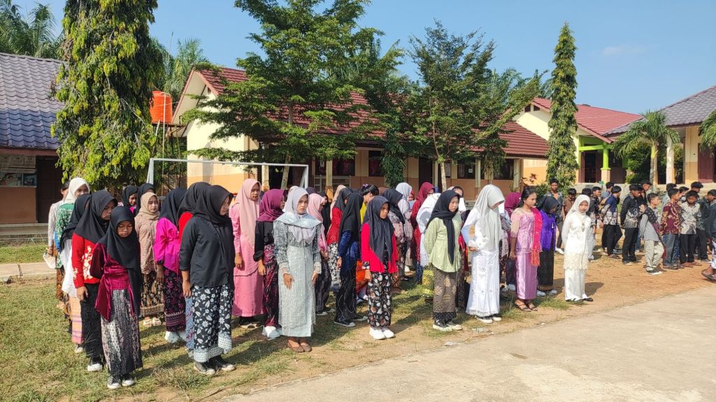 Halaman upacara sekolah tampak lebih berwarna dengan pakaian yang dikenakan oleh dewan guru dan murid-murid.